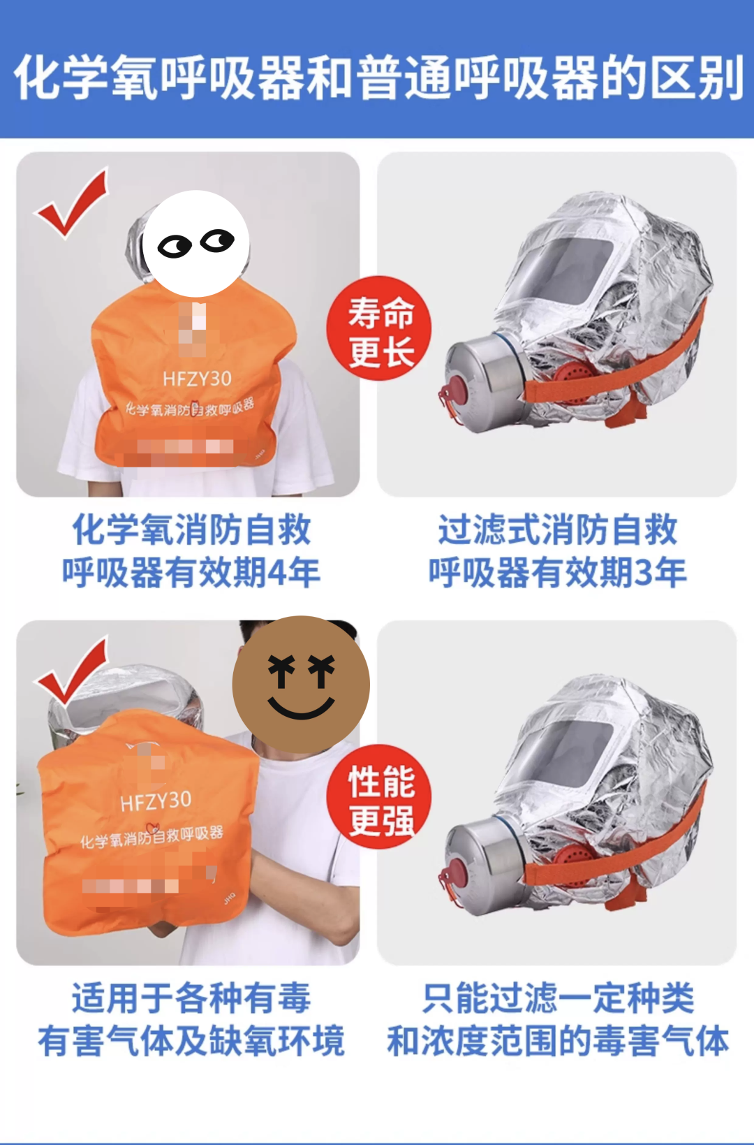 化学氧消防自救呼吸器,通过化学反应生成氧气,供佩戴者呼吸。佩戴者呼出的气体经过生氧药罐,与其中的生氧药剂反应生成氧气,吸气时,从气囊中吸入这些富氧空气,完成呼吸循环。有效延长了安全防护时间,对逃生和静坐待援有极大的帮助。